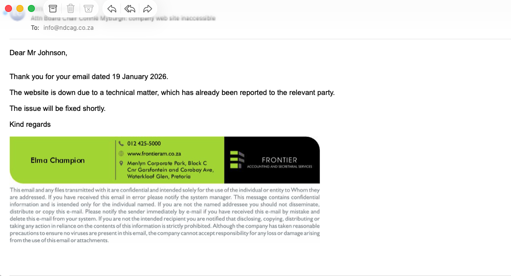 Wat sê dit eintlik vir ons? Miskien stel ons e-pos wat aan Cuma Zwane van CIPC gestuur is, waarin ons ‘n afskrif van die Kommuniké aan hom gestuur het, wat die algemene vlak van aanvaarding en geloof sal wees. Lees hier: www.ndcag.co.za/go/20260112-1