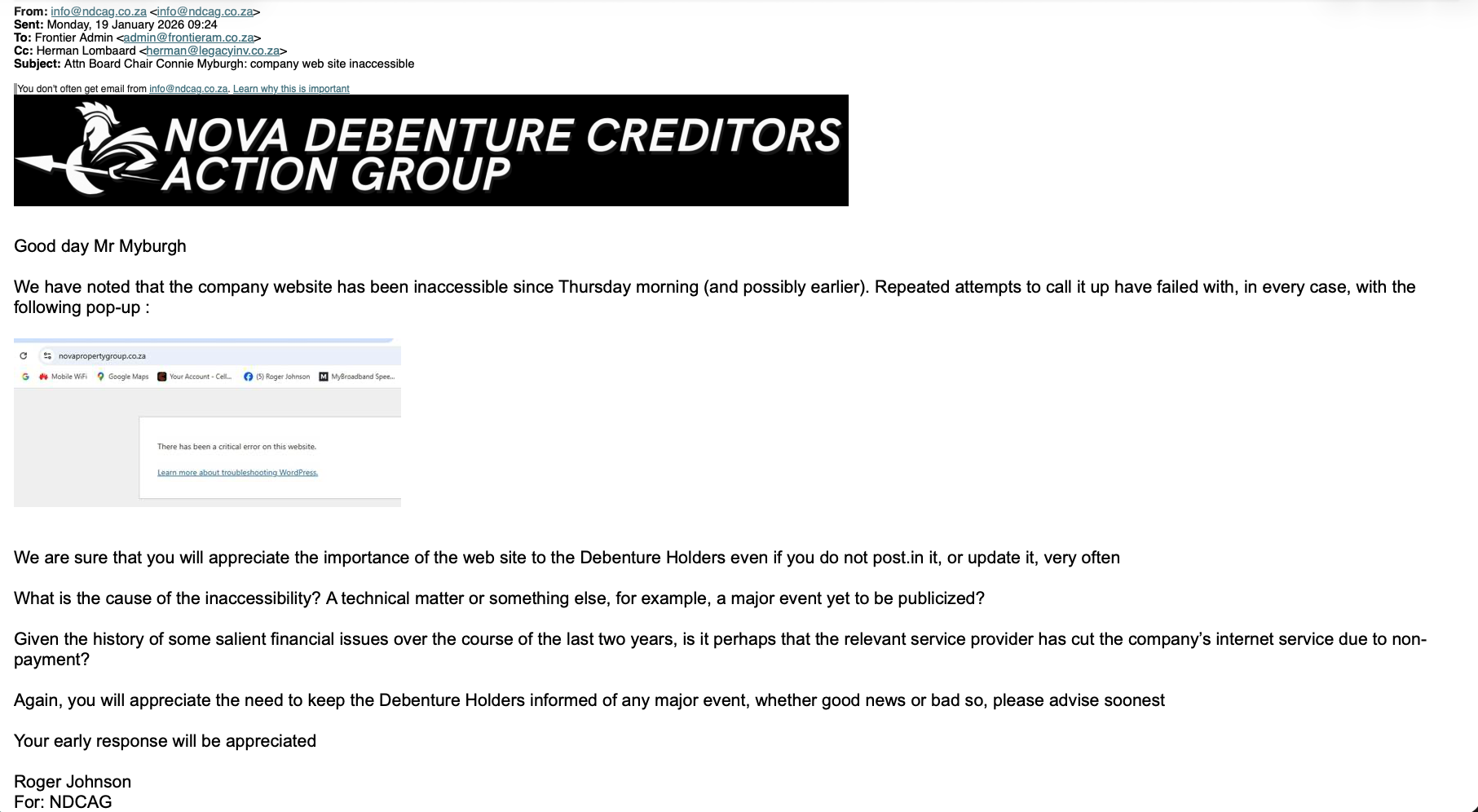 – die voorlopige likwidasie van Flora Centre weens wanbetaling op ‘n lening, maar sonder enige melding van hul plan, in weerwil van die CIPC-embargo op die verkoop van eiendomsbates, om die Carletonville- en Carnival Centre-eiendomme in skikking aan te bied (op te offer) en sodoende die likwidasie te ontsnap en die waardevoller eiendom te behou (Sien ons plasing van 28 November oor Flora Centre op beide die webwerf en die Facebook-blad)